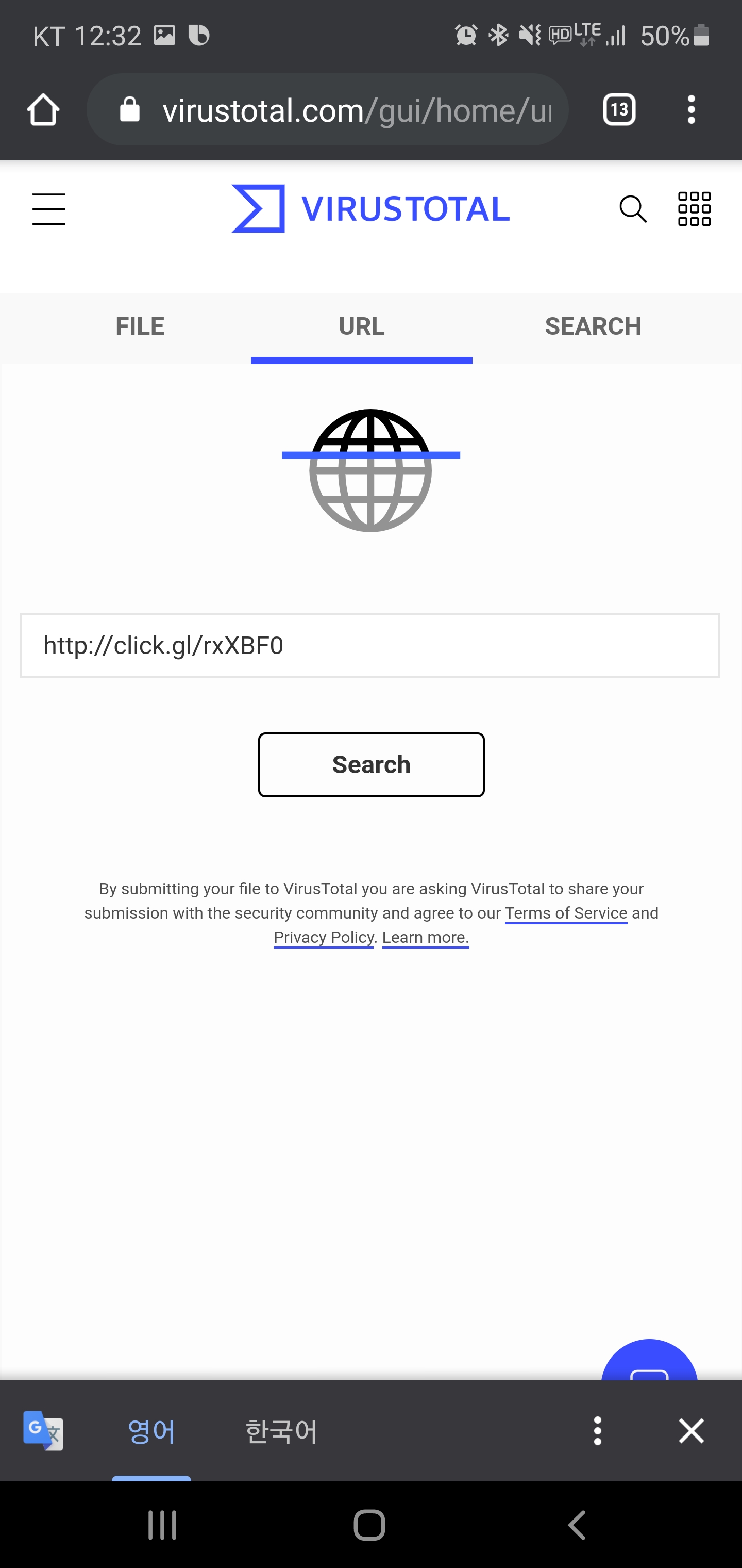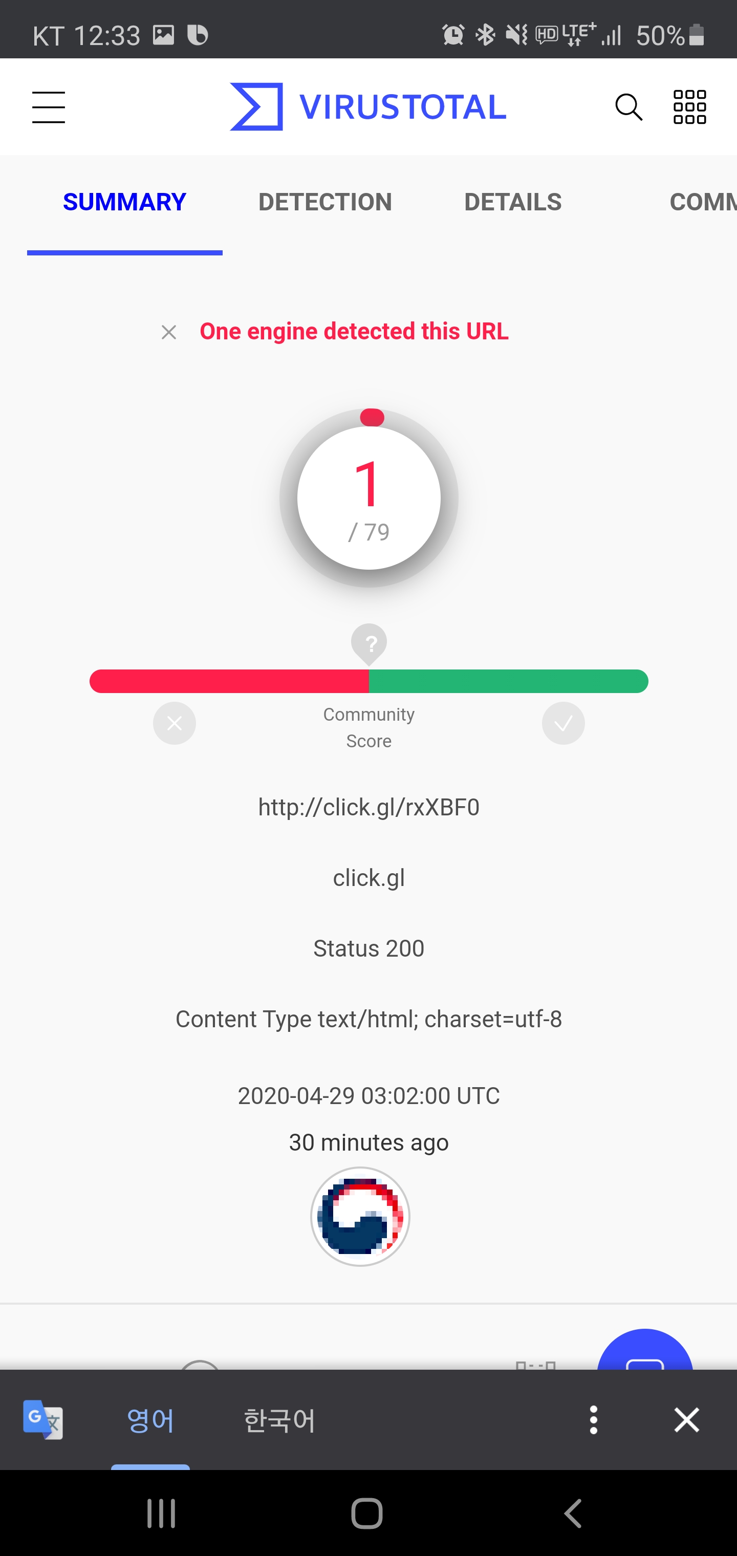 사실, 대부분의 사람들은 첫 번째 방식인 Whois 방식 확인보다는 의심 Url 전체 주소에 대해서 확인을 해보고 싶으실 겁니다. 그런 분들을 위해 친절하게도 Virustotal 사이트에서 한 방에 의심 Url의 정보를 확인해 줍니다.